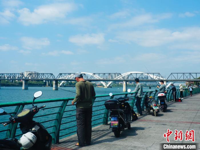 入秋,碧水藍天相互映襯,廣西柳州市的市民在柳江河的河岸上釣魚休閑?!±顙申? 攝