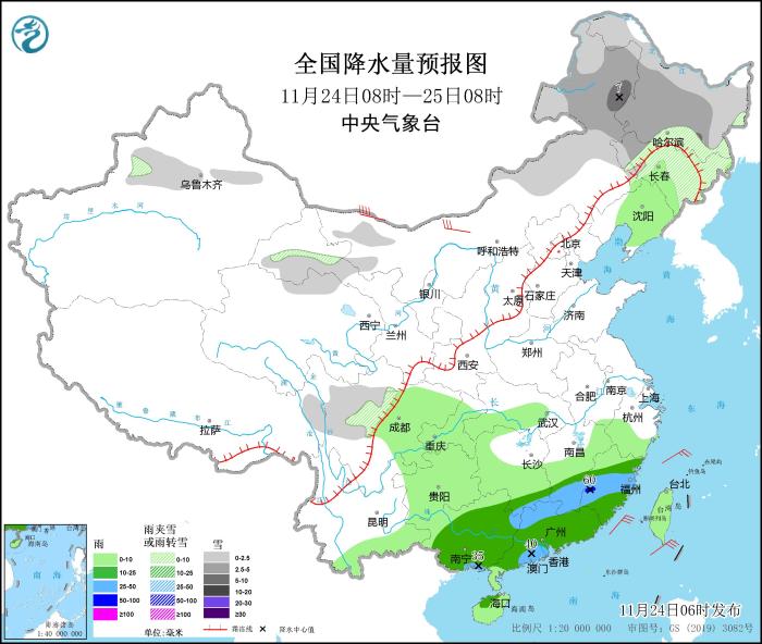 11月24日08時(shí)至25日08時(shí),內(nèi)蒙古東部、東北地區(qū)、新疆沿天山地區(qū)、甘肅河西、川西高原等地部分地區(qū)有小到中雪或雨夾雪,其中,內(nèi)蒙古東北部局地有大雪(5~7毫米)。江南南部、華南大部等地部分地區(qū)有中到大雨,局地暴雨(50~60毫米)。內(nèi)蒙古西部部分地區(qū)有5~7級(jí)風(fēng)(見圖1)。