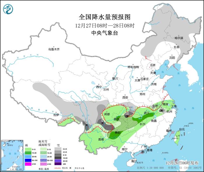 12月27日08時至28日08時,內(nèi)蒙古東部、黑龍江和吉林大部、西藏東部、湖北西部、湖南西部、貴州中北部、重慶東南部、川西高原、云南北部以及安徽大別山區(qū)和皖南山區(qū)等地部分地區(qū)有小到中雪,其中,安徽皖南山區(qū)、湖北西南部、川西高原南部、重慶東南部、貴州西北部、云南北部等地部分地區(qū)有大到暴雪(10~15毫米)。湖北中東部、湖南中東部、安徽南部、江蘇南部、浙江北部、江西西北部、廣西中西部、云南中南部、臺灣島等地部分地區(qū)有小到中雨。內(nèi)蒙古中部、河北北部部分地區(qū)有4~5級風(fēng)。東海南部海域、臺灣海峽、巴士海峽、南海大部海域、北部灣將有6~7級、陣風(fēng)8級的偏北或東北風(fēng),其中臺灣海峽、南海東北部的部分海域風(fēng)力可達8級、陣風(fēng)9級(見圖2)。