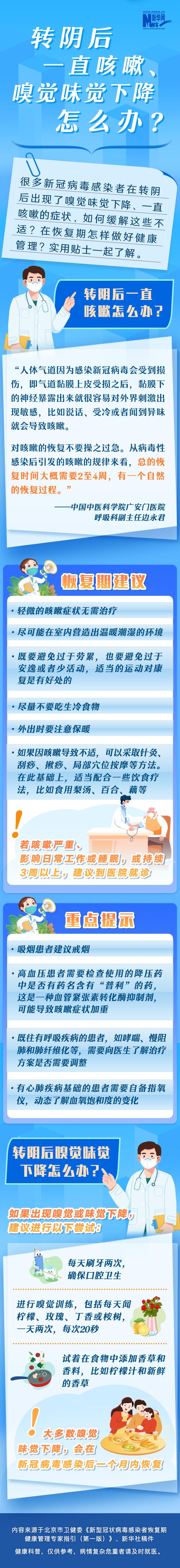 很多新冠病毒感染者在轉陰后出現(xiàn)了嗅覺味覺下降、一直咳嗽的癥狀,如何緩解這些不適?在恢復期怎樣做好健康管理?實用貼士一起了解。