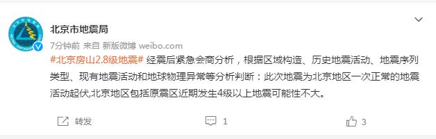 北京市地震局:近期發(fā)生4級(jí)以上地震可能性不大