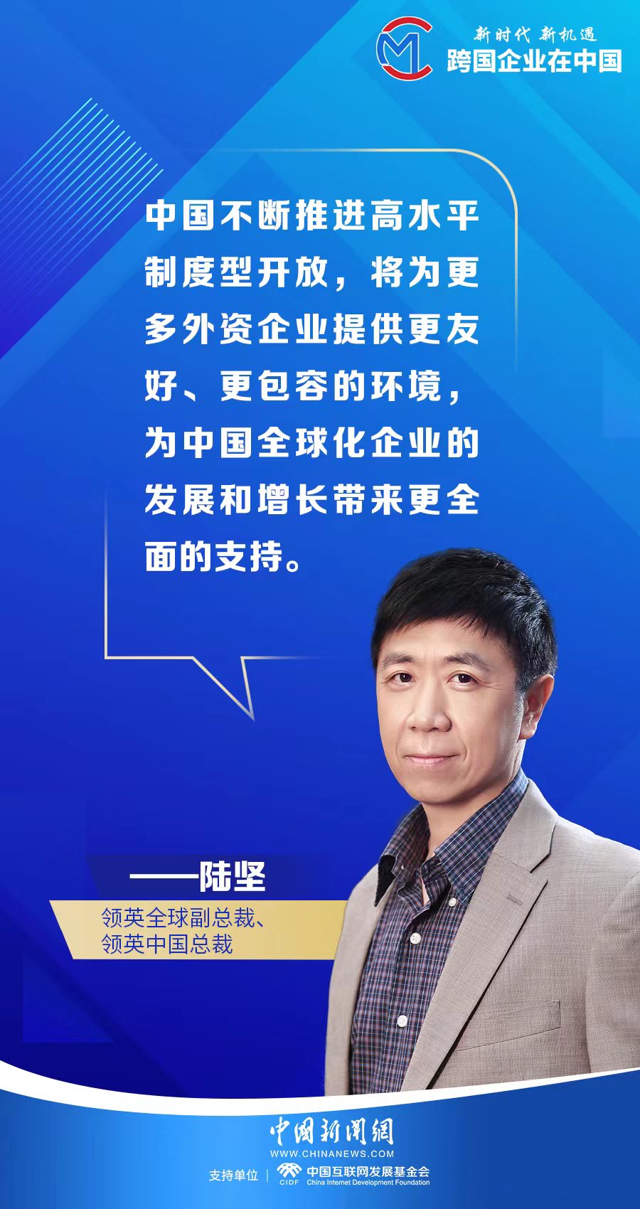 “中國不斷推進更高水平制度型開放,將為以領英為代表的更多外資企業(yè)提供更友好、更包容的環(huán)境,為中國全球化企業(yè)的發(fā)展和增長帶來更全面的支持,包括更廣的全球視野共享、更優(yōu)的全球資源協(xié)調,以及更多的全球機會連接?!标憟苑Q。