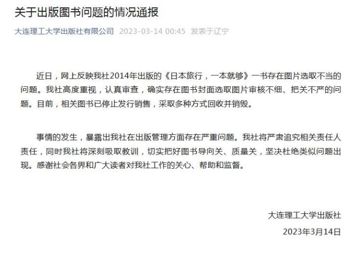 中新網(wǎng)3月14日電 據(jù)大連理工大學(xué)出版社有限公司官方微信消息,大連理工大學(xué)出版社14日發(fā)布情況通報(bào)稱,近日,網(wǎng)上反映大連理工大學(xué)出版社2014年出版的《日本旅行,一本就夠》一書存在圖片選取不當(dāng)?shù)膯?wèn)題。該社高度重視,認(rèn)真審查,確實(shí)存在圖書封面選取圖片審核不細(xì)、把關(guān)不嚴(yán)的問(wèn)題。目前,相關(guān)圖書已停止發(fā)行銷售,采取多種方式回收并銷毀。