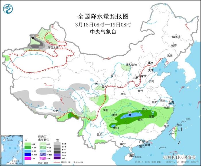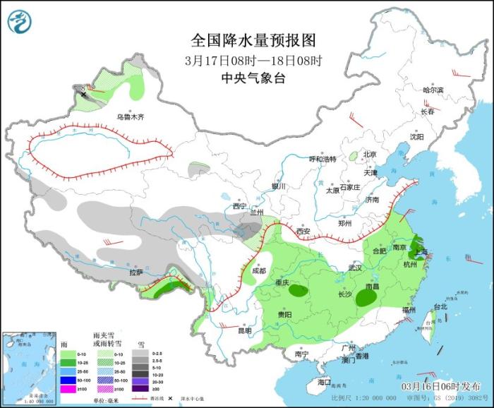 3月16日08時至17日08時,新疆沿天山地區(qū)和伊犁河谷、西藏東部和南部、青海東部和南部、川西高原等地部分地區(qū)有小到中雪或雨夾雪,局地有大雪(5~7毫米)。黃淮西部、江淮西部、江漢、江南北部和西部、西南地區(qū)東部等地部分地區(qū)有中到大雨,其中,貴州東部、湖南北部等地局地有暴雨(50~80毫米)。內蒙古中東部、東北地區(qū)、浙江北部等地部分地區(qū)有4~6級風。