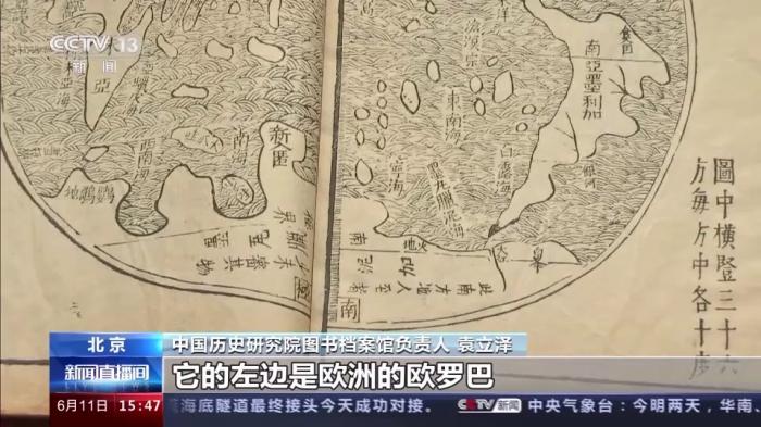 中國歷史研究院圖書檔案館負(fù)責(zé)人 袁立澤:這幅圖是16世紀(jì)末,西方第一批來華傳教士利瑪竇主持繪制的。把西方當(dāng)時先進的制圖技術(shù)帶到了中國,同時他有意識地吸收了中國的制圖經(jīng)驗和理念。今天我們所熟悉的七大洲四大洋,在圖中應(yīng)該說已經(jīng)標(biāo)示出了六大洲和三大洋,就是亞洲的亞細亞。它的左邊是歐洲的歐羅巴,南面就是今天的非洲叫利未亞,改變了以往以歐洲為中心的繪圖方式。它是中西文明交流互鑒的一個結(jié)晶和有力見證。
