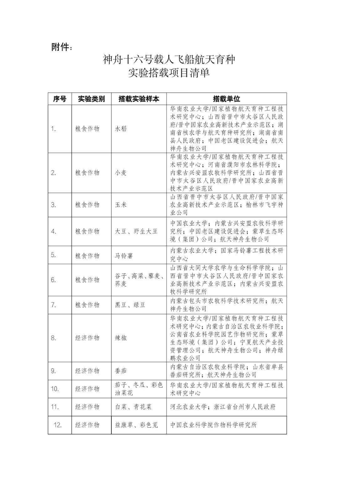 今日,中國(guó)載人航天工程辦公室公布神舟十六號(hào)載人飛船航天育種實(shí)驗(yàn)項(xiàng)目清單,詳情如下: