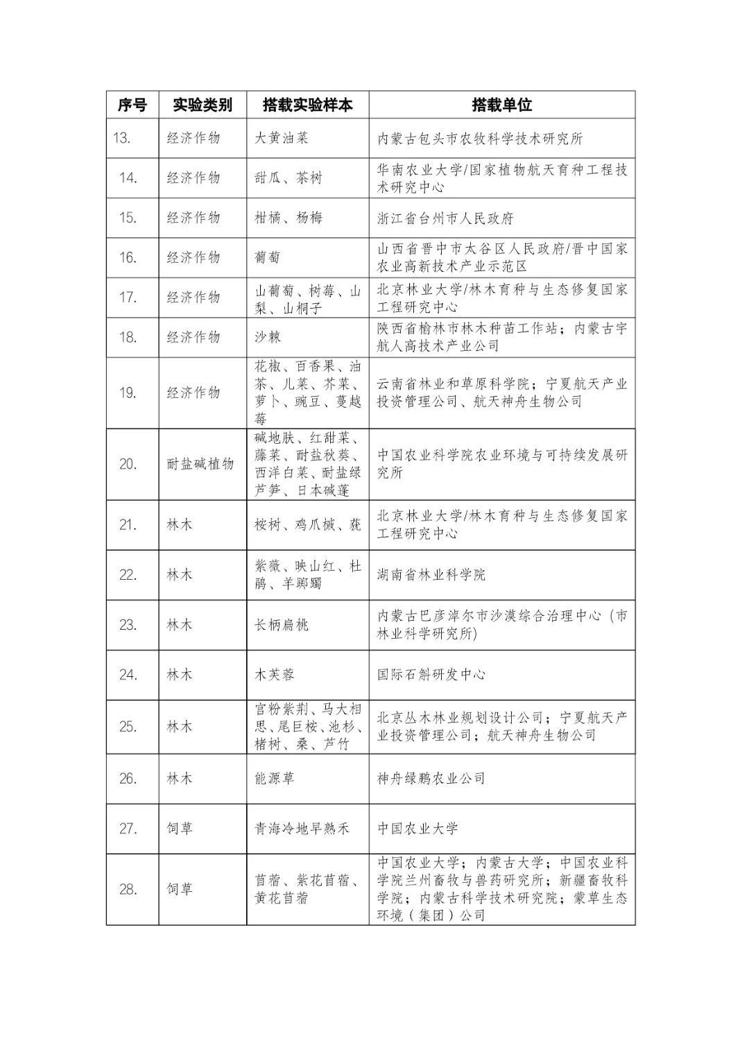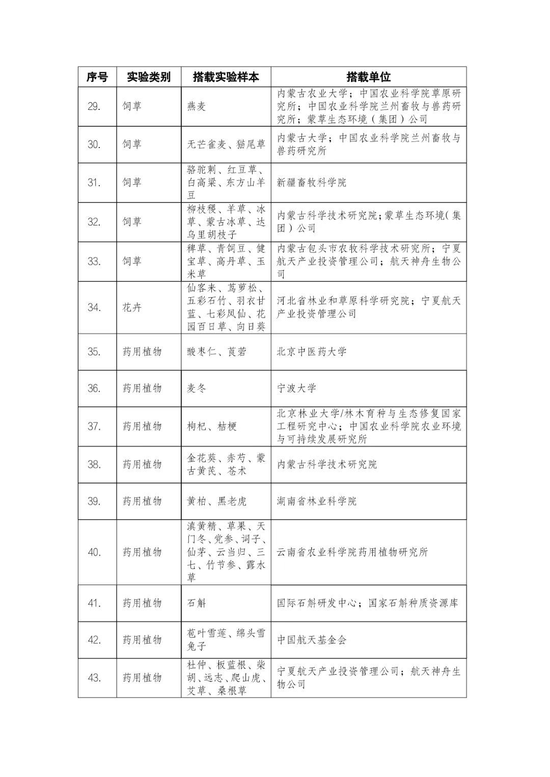載人航天工程立項(xiàng)實(shí)施以來(lái),始終注重提升工程綜合效益,致力服務(wù)國(guó)家經(jīng)濟(jì)社會(huì)發(fā)展。在工程歷次飛行任務(wù)中,均安排了航天育種搭載實(shí)驗(yàn)項(xiàng)目。從神舟十六號(hào)載人飛船開(kāi)始,中國(guó)載人航天工程辦公室向社會(huì)公開(kāi)征集航天育種搭載實(shí)驗(yàn)項(xiàng)目,于3月23日在工程官網(wǎng)發(fā)布《關(guān)于征集神舟系列載人飛船航天育種實(shí)驗(yàn)項(xiàng)目的機(jī)會(huì)公告》,同時(shí)在工程官網(wǎng)開(kāi)辟“航天育種搭載實(shí)驗(yàn)”管理平臺(tái),接受搭載需求單位申報(bào)實(shí)驗(yàn)項(xiàng)目。辦公室組織專家對(duì)申報(bào)項(xiàng)目進(jìn)行評(píng)審,遴選出53個(gè)單位的136種份航天育種實(shí)驗(yàn)材料實(shí)施搭載。包括農(nóng)作物47份(糧食作物種子12份、經(jīng)濟(jì)作物種子28份、耐鹽堿植物7份);林草、花卉和藥用植物76份(林木17份、飼草21份、花卉7份、藥用植物31份);微生物和其它13種(農(nóng)業(yè)微生物菌種2種、工業(yè)微生物菌種3種、食用菌3種、藻類和苔蘚5種)(清單附后)。