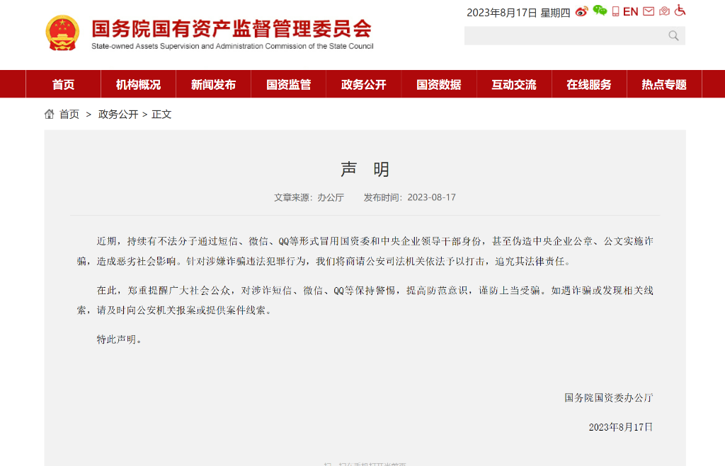 國務(wù)院國資委發(fā)布聲明打假 提醒公眾提高防范意識(shí)