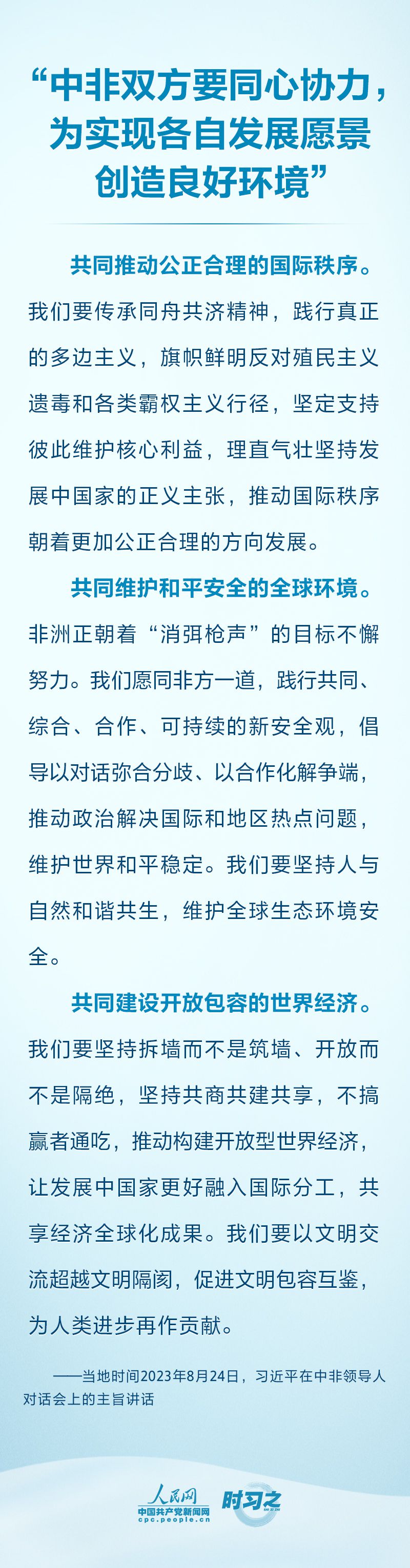 習(xí)近平呼吁中非雙方要同心協(xié)力,為實(shí)現(xiàn)各自發(fā)展愿景創(chuàng)造良好環(huán)境;并為規(guī)劃好下階段中非務(wù)實(shí)合作,提出3項(xiàng)舉措。
