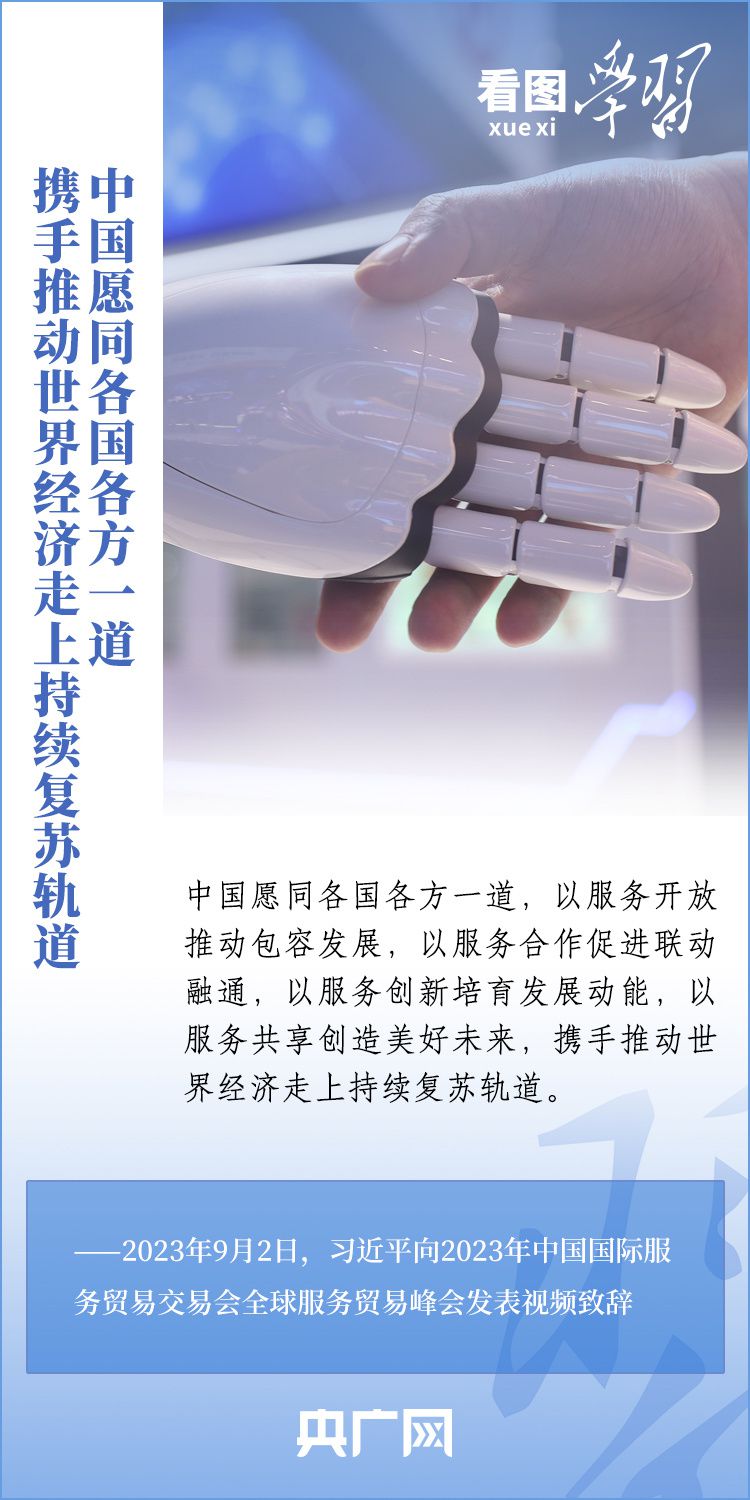 9月2日上午,以“開放引領(lǐng)發(fā)展 合作共贏未來”為主題的2023年中國國際服務貿(mào)易交易會在北京舉行。國家主席習近平向2023年中國國際服務貿(mào)易交易會全球服務貿(mào)易峰會發(fā)表視頻致辭表示,中國愿同各國各方一道,攜手推動世界經(jīng)濟走上持續(xù)復蘇軌道。一起來學習!