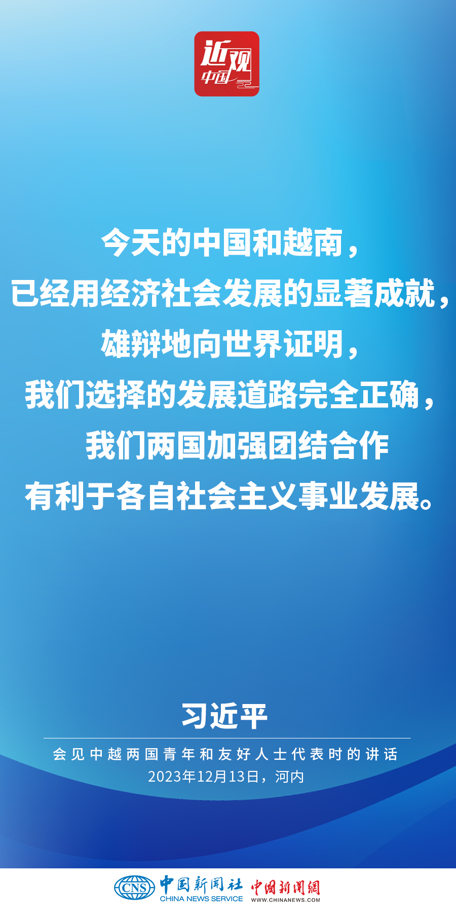 當?shù)貢r間12月13日下午,中共中央總書記、國家主席習近平和夫人彭麗媛在河內(nèi)同越共中央總書記阮富仲夫婦共同會見中越兩國青年和友好人士代表。他在題為《賡續(xù)傳統(tǒng)友誼,開創(chuàng)中越命運共同體建設(shè)新征程》的重要講話中指出,展望未來,我們要始終不忘初心,牢記使命,攜手走好各自社會主義道路,讓工業(yè)化現(xiàn)代化建設(shè)成果更多惠及兩國人民,共同為人類進步事業(yè)作出更大貢獻。