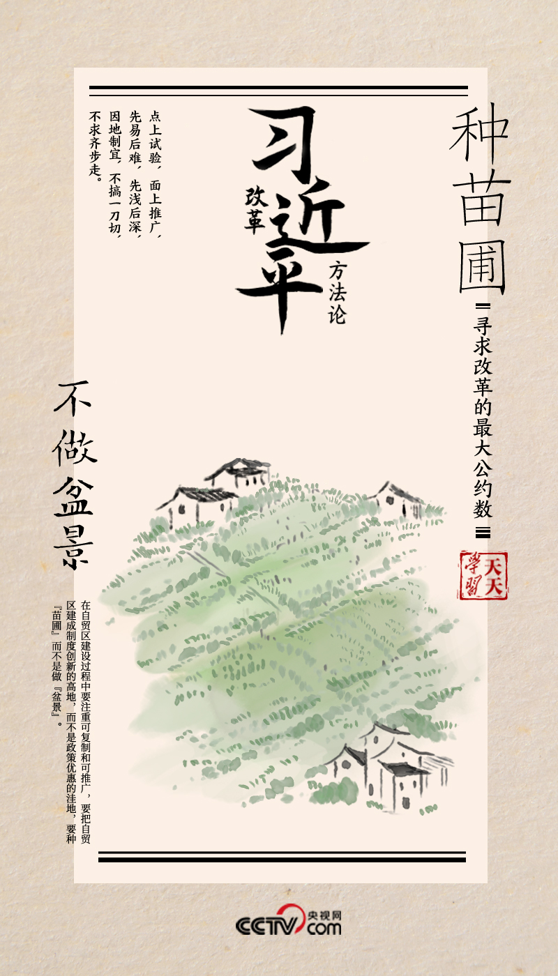 “要種‘苗圃’而不是做‘盆景’”,正是習(xí)近平對改革試點方法論的形象比喻和精辟總結(jié)。而正定縣農(nóng)村研究所和上海自貿(mào)試驗區(qū),都是對這一方法論的生動實踐。