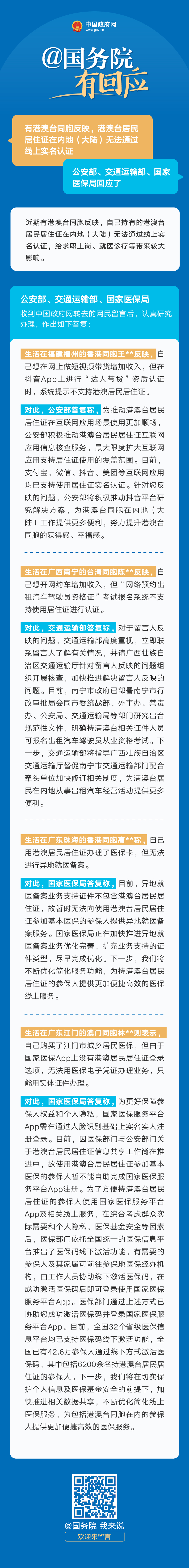 公安部、交通運輸部、國家醫(yī)保局答網(wǎng)民關(guān)于“加快推進(jìn)港澳臺居民居住證線上實名認(rèn)證”的留言
