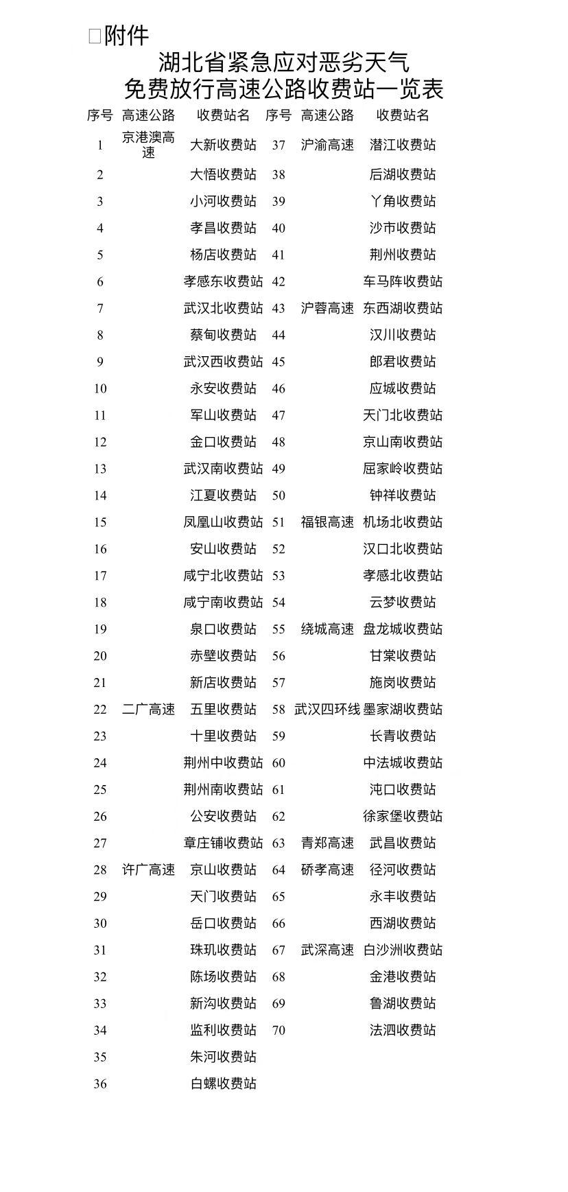 中新網(wǎng)2月6日電 記者6日從交通運輸部獲悉,針對近日湖北省境內(nèi)部分高速公路路段因惡劣天氣造成車輛擁堵嚴重的情況,結(jié)合最新天氣預報及路網(wǎng)運行情況,經(jīng)湖北省人民政府和交通運輸部同意,調(diào)整免費放行收費站所及時間區(qū)間,自2024年2月5日20:00至6日12:00,對在指定收費站駛出高速公路的所有車輛實施免費放行。具體70座收費站如下↓(中新財經(jīng))