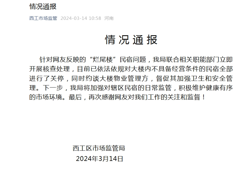 洛陽(yáng)通報(bào)“爛尾樓”民宿問(wèn)題:對(duì)樓內(nèi)不具備經(jīng)營(yíng)條件的民宿全部關(guān)停