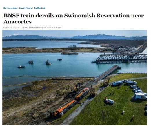中新網(wǎng)3月17日電 綜合外媒報道,當(dāng)?shù)貢r間16日早上,美國一列貨運火車在華盛頓州斯卡吉特縣發(fā)生脫軌事故,約5000加侖(約18927升)柴油被泄漏在事發(fā)地點阿納科特斯市的Swinomish保護(hù)區(qū)。