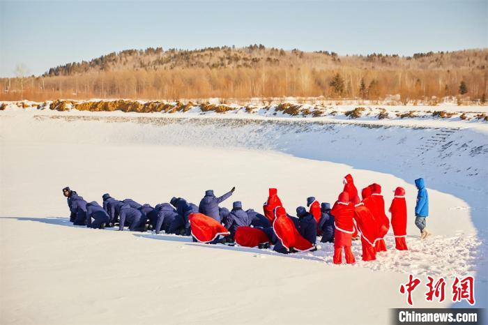 “傻嘟嘟”團(tuán)隊(duì)在雪地拍攝“火箭發(fā)射”視頻 黑龍江省塔河縣文旅局供圖