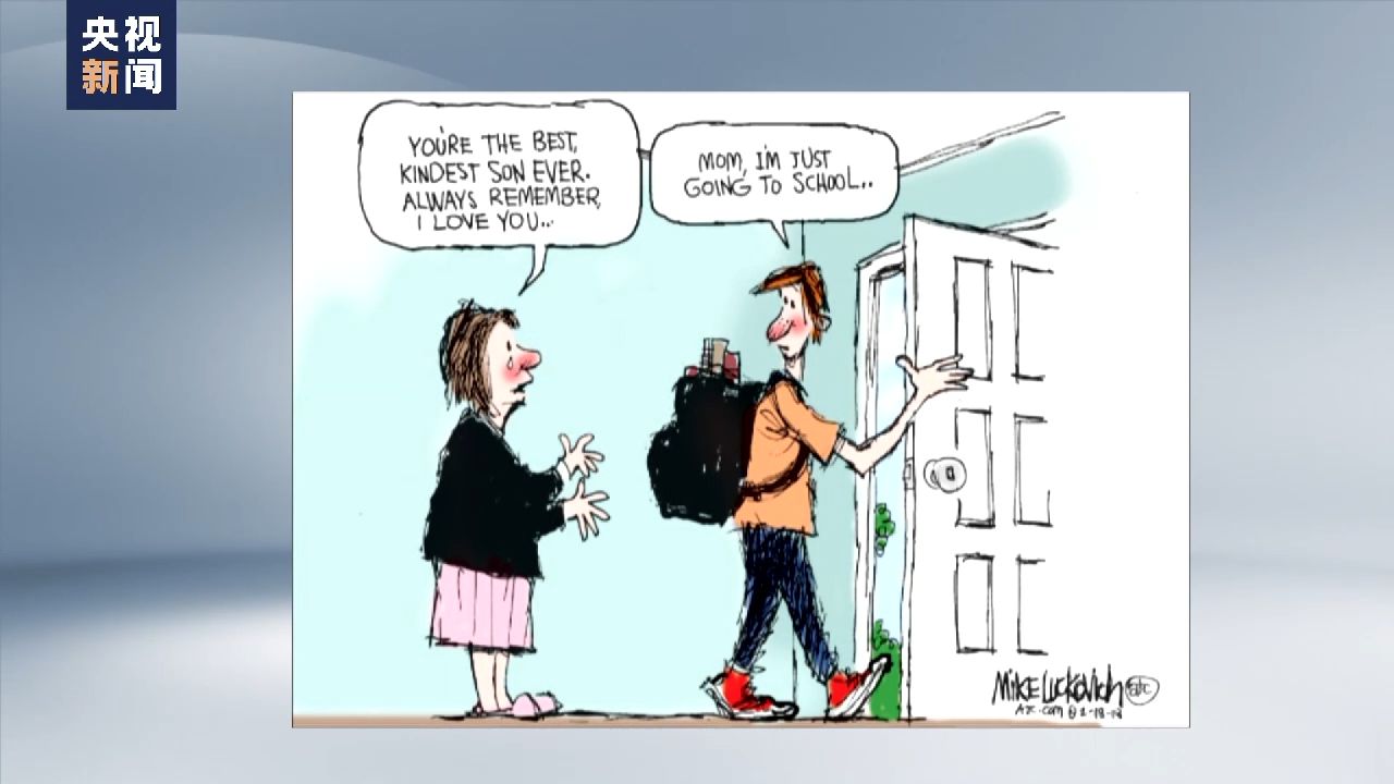槍支暴力已經(jīng)成為美國孩子的“頭號殺手”。在這幅漫畫中,母親流著眼淚,對準備出門上學的孩子叮囑道,“你是最好、最善良的兒子,永遠要記得這一點,我愛你。” 孩子則有點疑惑地說,“媽媽,我只是去學校?!?這就是校園槍擊案頻發(fā)令無數(shù)父母終日膽戰(zhàn)心驚的真實寫照。