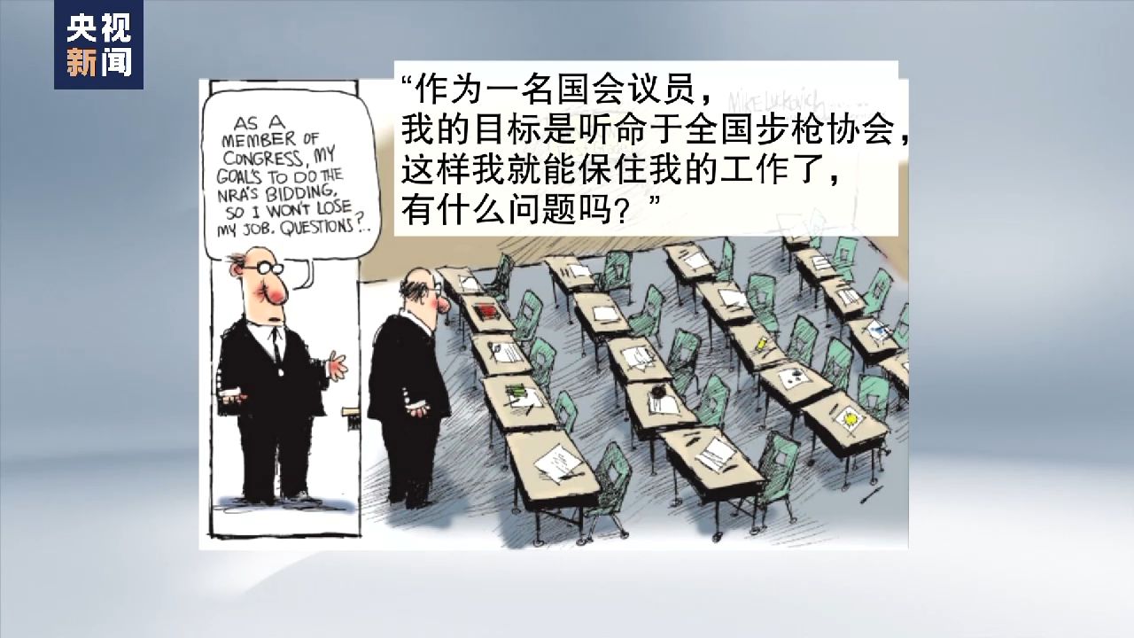 今年,美國已經(jīng)發(fā)生130起造成至少4人死傷的大規(guī)模槍擊事件。政客與利益集團的深度捆綁,令美國深陷槍支暴力的“惡性循環(huán)”。不少漫畫對此都有生動的刻畫。