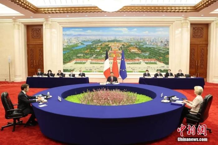 4月6日下午,中國國家主席習(xí)近平在北京人民大會(huì)堂同法國總統(tǒng)馬克龍、歐盟委員會(huì)主席馮德萊恩舉行中法歐三方會(huì)晤。中新社記者 盛佳鵬 攝