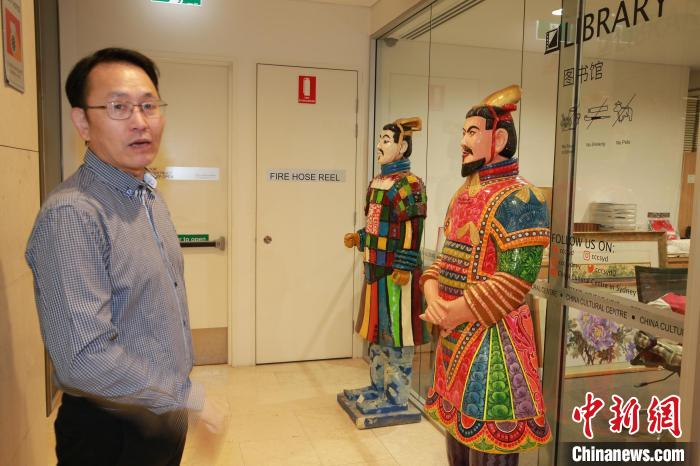 圖為悉尼中國文化中心內(nèi)彩色兵馬俑藝術展品?!≈行律缬浾?顧時宏 攝