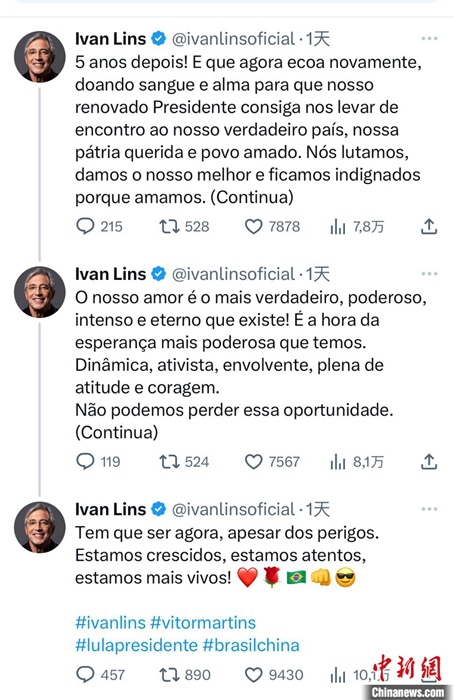 巴西音樂家伊萬(wàn)·林斯在社交媒體連發(fā)多條留言,引發(fā)網(wǎng)絡(luò)熱潮。截圖