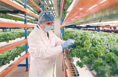 在阿聯(lián)酋迪拜阿勒馬克圖姆國(guó)際機(jī)場(chǎng)不遠(yuǎn)處,一棟四四方方、外觀簡(jiǎn)約的辦公樓里,垂直農(nóng)場(chǎng)“我的菜園”里一派繁忙景象。
