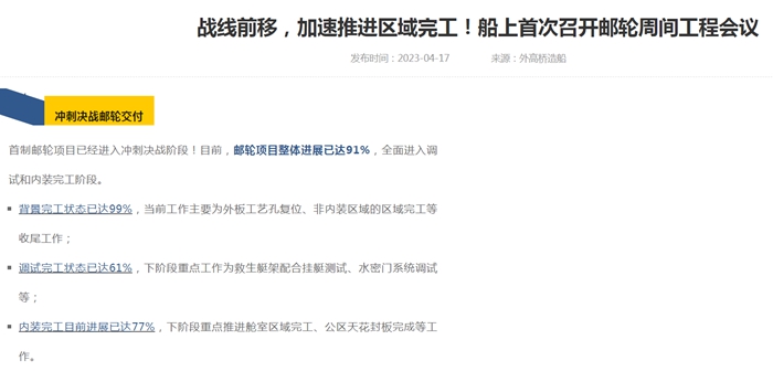 在這之前,3月底,首艘國產(chǎn)大郵輪“誓師保交付”大會舉行,外高橋造船公司黨委委員、副總經(jīng)理、大型郵輪總建造師周琦表示,堅決完成首制船年底交付的歷史使命。