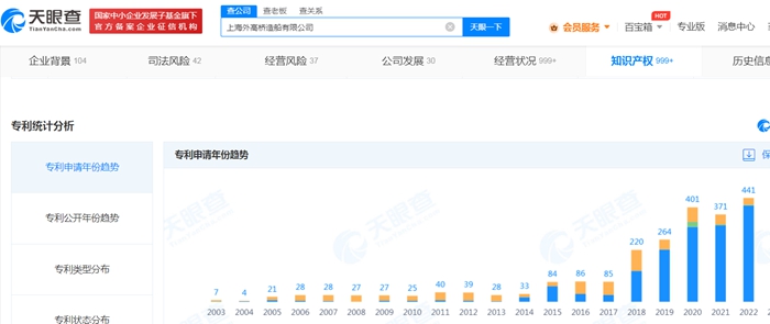 天眼查顯示,近三年,外高橋造船專利申請數(shù)量猛增,2020年為401件,2021年371件,2022年達(dá)到441件。這其中有不少專利涉及到大型郵輪,例如“大型郵輪反彈式水封地漏”“大型郵輪醫(yī)院抽風(fēng)管過濾裝置”等。