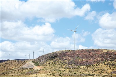 在南非北開(kāi)普省德阿鎮(zhèn),中國(guó)龍?jiān)措娏瘓F(tuán)南非公司運(yùn)營(yíng)的德阿風(fēng)電項(xiàng)目風(fēng)機(jī)。