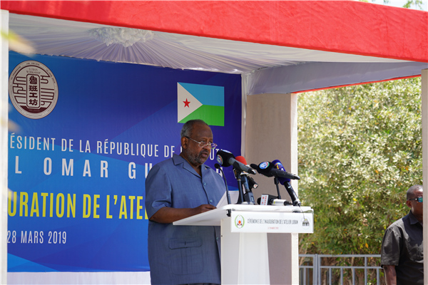 2019年3月28日,吉布提總統(tǒng)蓋萊在魯班工坊啟動(dòng)儀式上致辭。天津鐵道職業(yè)技術(shù)學(xué)院供圖