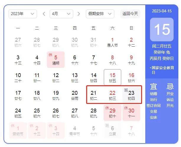 4月21日至23日放假調(diào)休,共3天