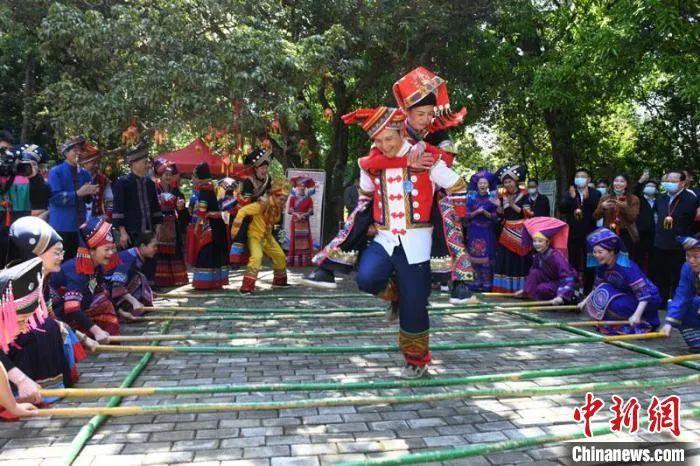 壯族民眾跳竹竿舞。林浩 攝