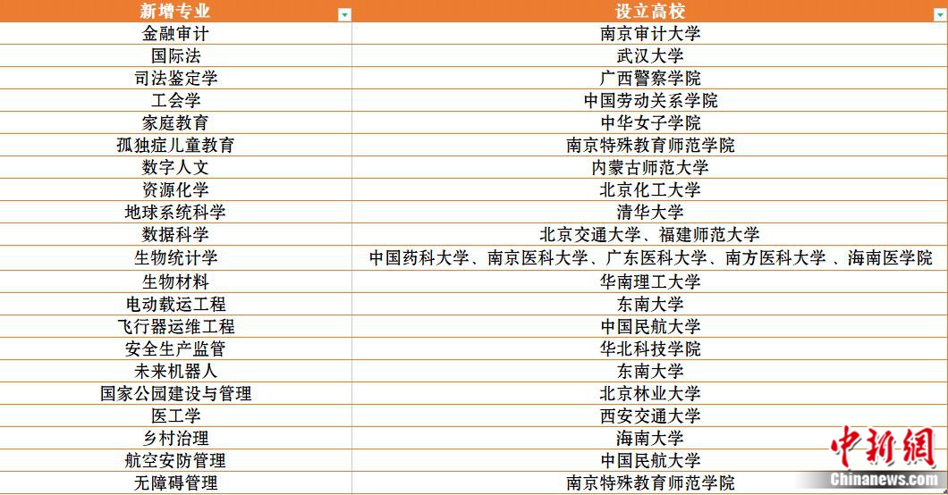 記者梳理發(fā)現(xiàn),21種新專業(yè)涉及10大類,包括金融審計(jì)、國際法、司法鑒定學(xué)、工會學(xué)、家庭教育、孤獨(dú)癥兒童教育、數(shù)字人文、資源化學(xué)、地球系統(tǒng)科學(xué)、數(shù)據(jù)科學(xué)、生物統(tǒng)計(jì)學(xué)、生物材料、電動載運(yùn)工程、飛行器運(yùn)維工程、安全生產(chǎn)監(jiān)管、未來機(jī)器人、國家公園建設(shè)與管理、醫(yī)工學(xué)、鄉(xiāng)村治理、航空安防管理、無障礙管理。