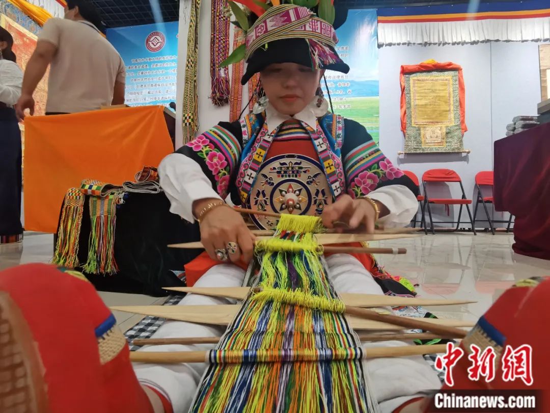 2022年6月,甘肅省張掖市,甘肅甘南藏族自治州舟曲縣藏族姑娘,展示省級非遺織錦帶。閆姣 攝