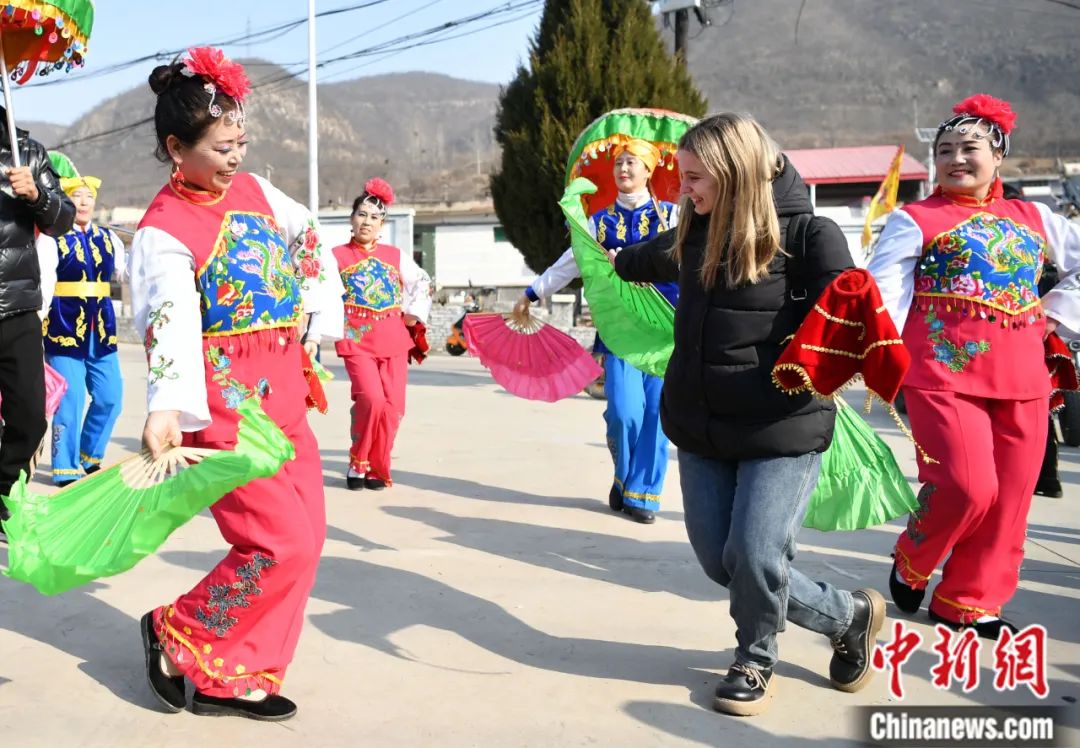 2023年2月,中國傳統(tǒng)節(jié)日元宵節(jié),河北省石家莊市井陘縣小作鎮(zhèn)桃林坪村,俄羅斯留學生曉燕(右二)體驗非遺“井陘拉花”。翟羽佳 攝