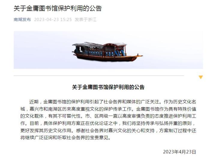 中新網(wǎng)4月23日電 近期,金庸圖書(shū)館的保護(hù)利用引發(fā)關(guān)注。浙江省嘉興市南湖區(qū)人民政府今日通過(guò)微信公眾號(hào)發(fā)布公告稱(chēng),作為歷史文化名城,嘉興市和南湖區(qū)歷來(lái)高度重視文化的保護(hù)傳承工作。金庸圖書(shū)館作為具有特殊價(jià)值的文化載體,有其不可替代性。市、區(qū)兩級(jí)一直以高度審慎負(fù)責(zé)的態(tài)度推進(jìn)保護(hù)利用工作。目前,具體保護(hù)利用方案正在優(yōu)化論證之中,南湖區(qū)將堅(jiān)持傳承與弘揚(yáng)并重的原則,更好發(fā)揮其歷史文化作用。感謝社會(huì)各界對(duì)嘉興文化的關(guān)心和支持,方案制訂過(guò)程中還將繼續(xù)廣泛征詢和聽(tīng)取社會(huì)各界的寶貴意見(jiàn)。