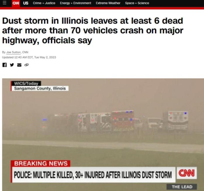 中新網(wǎng)5月2日電 綜合美媒消息,當?shù)貢r間5月1日,由于沙塵暴導致能見度降低,70余輛汽車在美國伊利諾伊州55號州際公路蒙哥馬利縣法默斯維爾鎮(zhèn)附近路段相撞,事故已造成至少6人死亡,37人受傷入院。