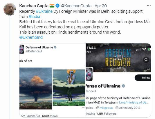 據(jù)俄新社報(bào)道,印度信息和廣播部高級(jí)顧問(wèn)古普塔也對(duì)此表達(dá)了強(qiáng)烈的不滿(mǎn),他在推特上轉(zhuǎn)發(fā)這一截圖,并寫(xiě)道,“最近烏克蘭副外長(zhǎng)曾在新德里請(qǐng)求印度支持。這張偽造圖背后隱藏著烏克蘭政府的真實(shí)面目。印度教女神卡莉被諷刺地畫(huà)在一張宣傳海報(bào)上。這是對(duì)全世界印度教徒感情的攻擊”。