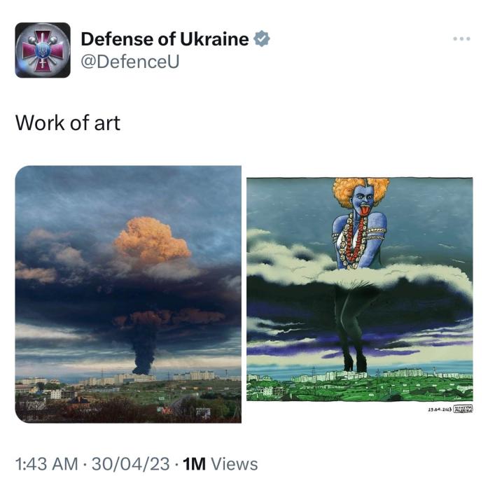 據(jù)俄新社、《印度斯坦時(shí)報(bào)》等多家媒體描述,烏國(guó)防部4月30日發(fā)布的這條推文中包含兩張圖片,第一張描繪了塞瓦斯托波爾灣一油庫(kù)遭無(wú)人機(jī)襲擊后升起的煙柱;另一張則是以第一張為基礎(chǔ)創(chuàng)作的漫畫(huà),爆炸的濃煙中多了一名女性形象,她擺出與瑪麗蓮·夢(mèng)露掩住裙擺相似的姿勢(shì),而這一女性形象本身又與印度教女神卡莉相似。烏克蘭國(guó)防部對(duì)圖片的描述是“藝術(shù)作品(work of art)”。