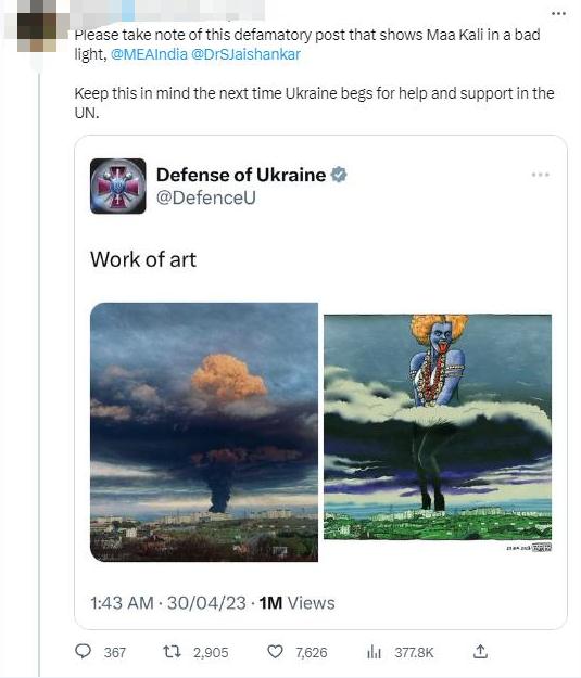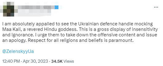 有推特網(wǎng)友@印度外交部和外長(zhǎng)蘇杰生“請(qǐng)注意這篇詆毀女神卡莉的誹謗帖子。下次烏克蘭在聯(lián)合國(guó)尋求幫助和支持時(shí),請(qǐng)記住這一點(diǎn)。”