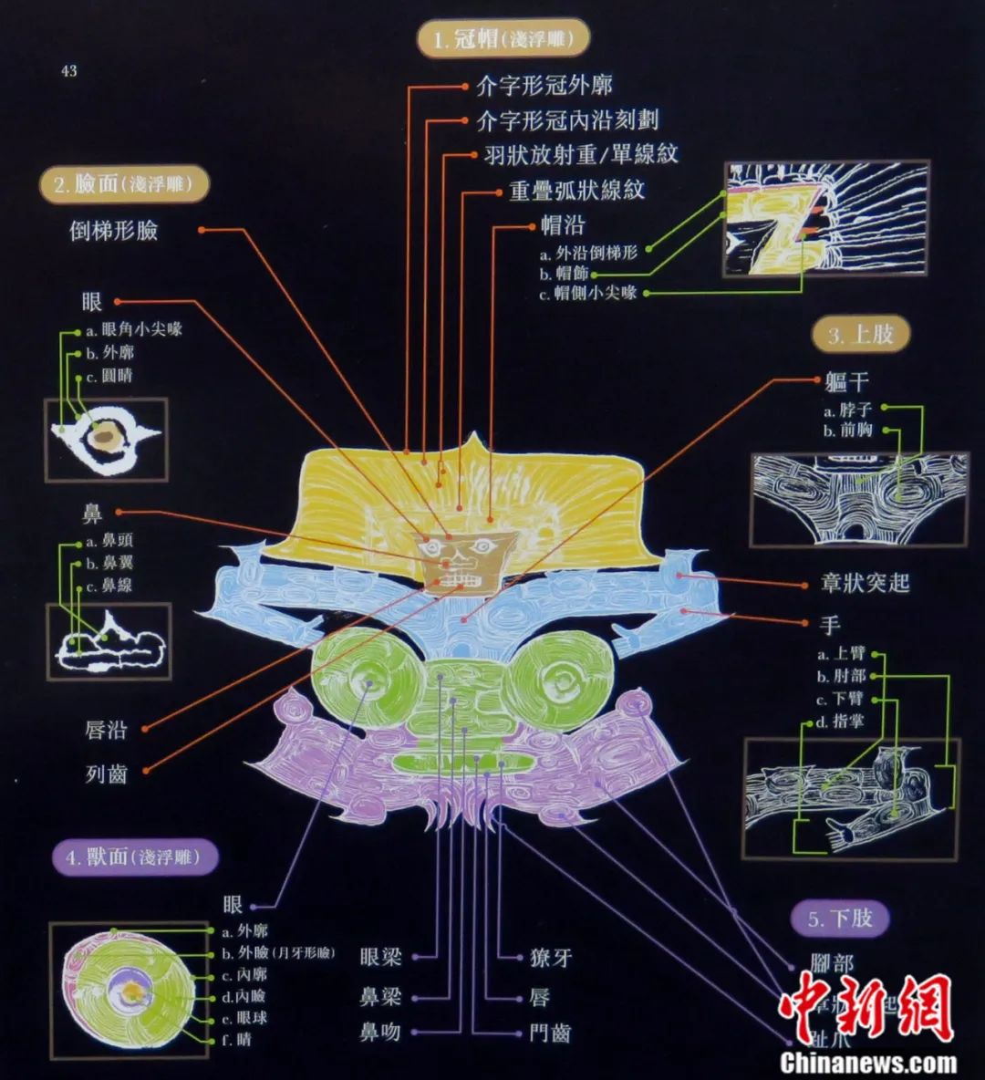 這個圖案的主體為“神人”,面部呈倒梯形,眼睛、鼻子、牙齒都非常寫實?!吧袢恕鳖^上還戴有高聳的羽冠,內(nèi)層刻有連續(xù)卷云紋的帽飾,外層為放射狀羽翎大冠。“神人”的四肢都以陰紋細刻而成,上肢作抬臂、彎肘狀,五指平張?!吧袢恕钡纳硐率且恢环诘厣系纳瘾F(形似老虎),外框有橢圓形的眼瞼,之間以橋形凸面相連,有鼻梁和鼻翼,闊嘴內(nèi)有尖利的牙齒。