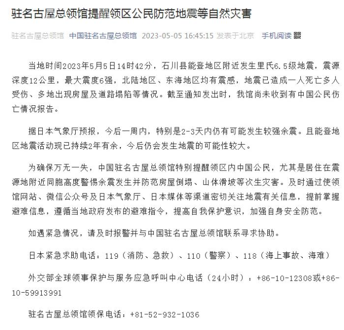 為確保萬無一失,中國駐名古屋總領(lǐng)館特別提醒領(lǐng)區(qū)內(nèi)中國公民,尤其是居住在震源地附近同胞高度警惕余震發(fā)生并防范房屋倒塌、山體滑坡等次生災(zāi)害。及時通過使領(lǐng)館網(wǎng)站、微信公眾號及日本氣象廳、日本媒體等渠道密切關(guān)注地震有關(guān)信息,提前掌握避難信息,遵循當(dāng)?shù)卣l(fā)布的避難指令,提高自我保護意識,加強自身安全防范。