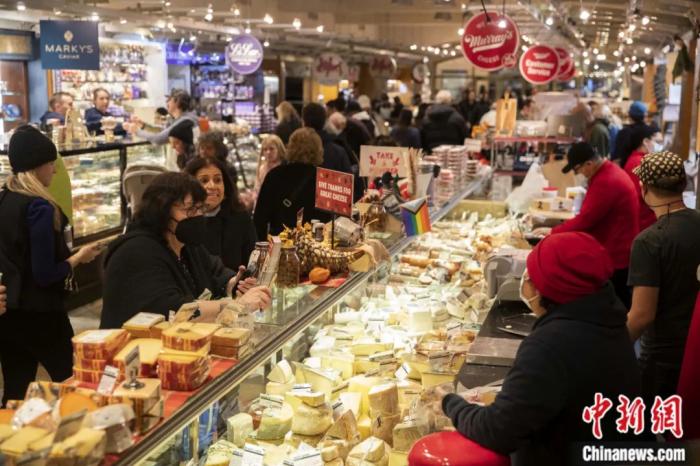 2022年冬季,顧客在紐約中央車站市場(chǎng)詢問奶酪價(jià)格。美國在當(dāng)年遭遇了40年來最嚴(yán)重的通貨膨脹。消費(fèi)者價(jià)格指數(shù)(CPI)同比漲幅在6月達(dá)到9.1%的峰值后,一直保持在7%以上的高位,持續(xù)“高燒”的通脹令經(jīng)濟(jì)承壓。廖攀 攝