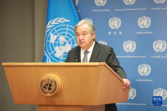 5月17日,在位于紐約的聯(lián)合國(guó)總部,聯(lián)合國(guó)秘書(shū)長(zhǎng)古特雷斯在記者會(huì)上講話。新華社記者謝鍔攝
