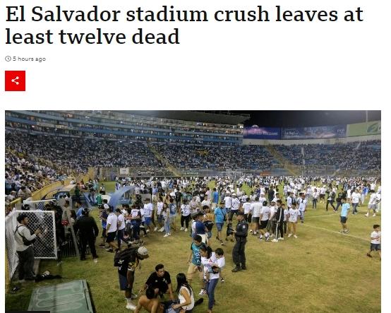 據(jù)英國(guó)廣播公司(BBC)報(bào)道,當(dāng)晚,圣薩爾瓦多庫(kù)斯卡特蘭球場(chǎng)舉行一場(chǎng)全國(guó)足球賽的四分之一決賽。不少因購(gòu)買(mǎi)假票無(wú)法入場(chǎng)的球迷試圖強(qiáng)行擠入球場(chǎng),其間發(fā)生人員踩踏,造成傷亡。多名傷者傷情較重。