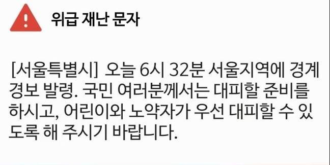 “今天6時32分首爾地區(qū)發(fā)布警戒警報。請各位國民做好躲避準備,讓兒童和老弱者優(yōu)先躲避?!碑斕烨宄?,首爾市民收到這條危急災害通知,手機同時響起警笛聲。