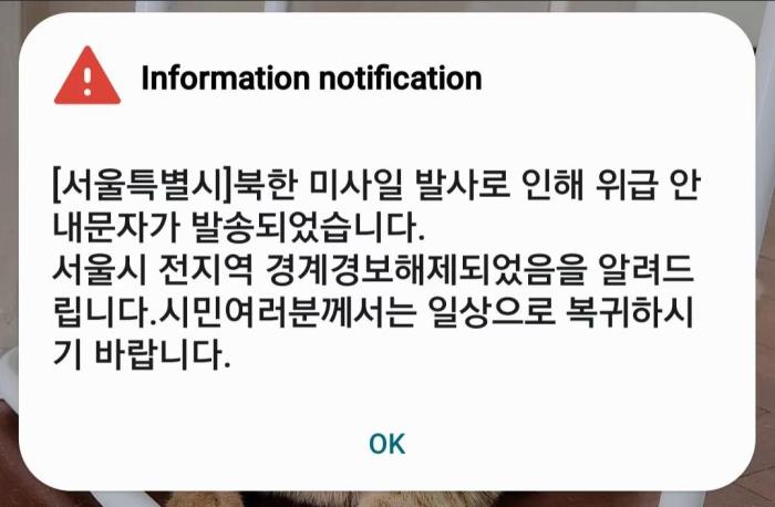 7時26分左右,首爾市再次發(fā)布通知稱,“由于朝鮮發(fā)射導彈,發(fā)送了危急災害通知。在此通知,首爾市整個地區(qū)的警戒警報已經(jīng)解除。希望各位市民回到日常生活中去。”