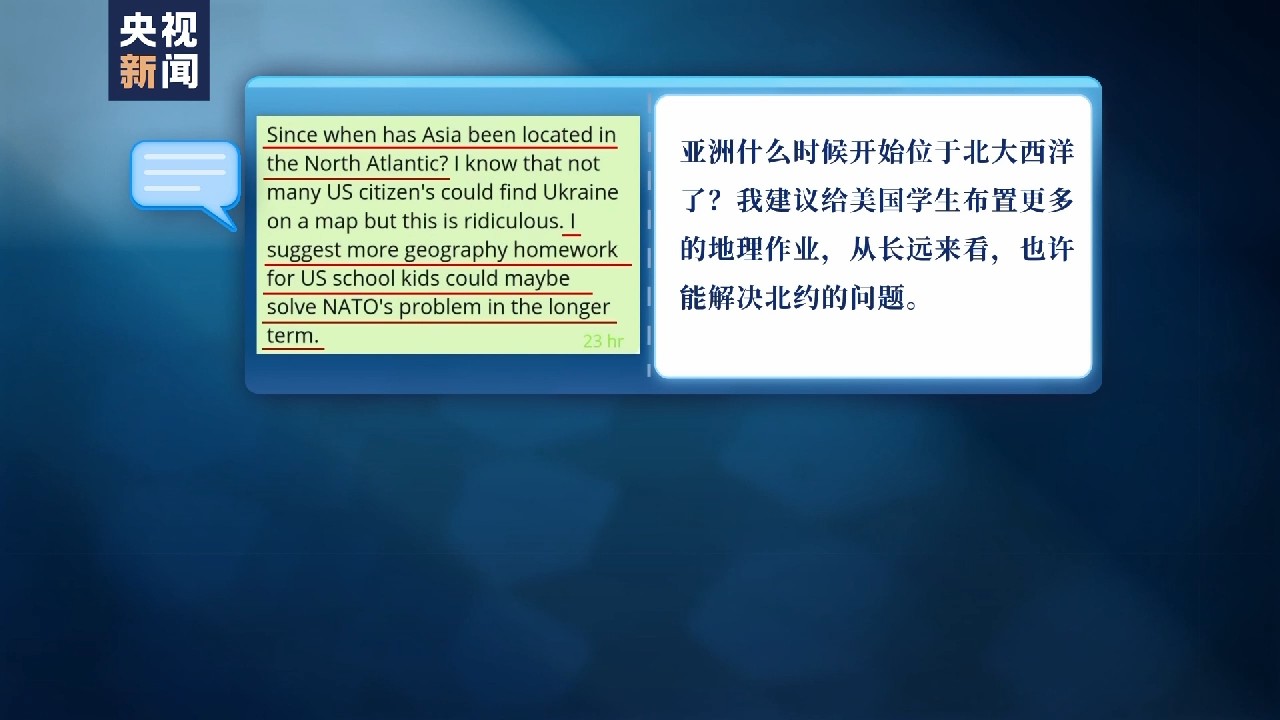 “亞洲什么時(shí)候開始位于北大西洋了?我建議給美國學(xué)生布置更多的地理作業(yè),從長遠(yuǎn)來看,也許能解決北約的問題?!?/p>