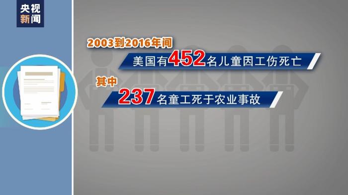 農(nóng)業(yè)領(lǐng)域是美國雇傭童工的重災(zāi)區(qū)之一。據(jù)美國非營利組織“農(nóng)場工人就業(yè)項目聯(lián)合會”提供的數(shù)據(jù),美國仍有50萬至80萬名童工在農(nóng)場工作。農(nóng)場勞作繁重、條件艱苦,童工還常被置于因天氣、農(nóng)藥及使用農(nóng)具農(nóng)機(jī)所產(chǎn)生的危險中?!度A盛頓郵報》報道,2003年至2016年間,美國有452名兒童因工傷死亡,其中237名童工死于農(nóng)業(yè)事故。